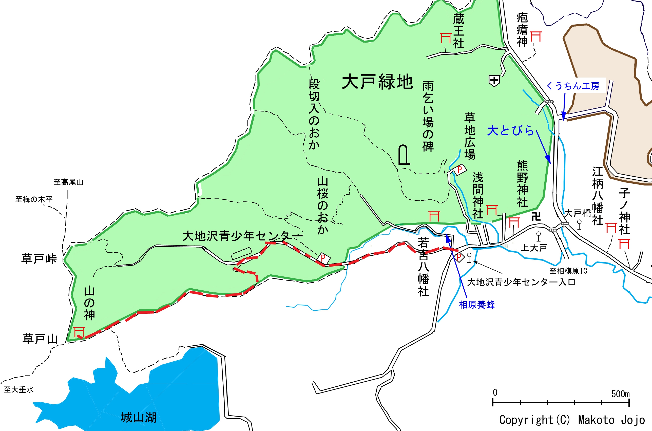 相原町大戸の丑田地区、鎌倉古道沿いの山頂に、文政10年5月(1827年)の建立られ祀られた。近年土地開発の流れで大戸観音堂に遷されていた。その後大地沢の山林が昭和61年3月 未曾有の大雪害に襲われ又復旧に際し幾多の困難に遭遇したので地域の発願により相原町の山林の安全と豊穣を祈願して草戸山山頂に遷座を勧請した山ノ神