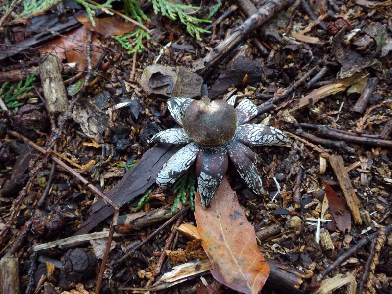 扁球形の袋の中に作る胞子の外側には皮質の厚い外皮があり、成熟すると外皮は7片から10片に裂け、星形に開く。星型の座布団の上に胞子の入った袋が乗っている形になり、胞子は袋の先端の穴から放出される。外皮はおもに2層の構造となっており、内側の層が水分を吸収して膨張することで乾湿に合わせ、開閉する。乾燥すると外皮は丸まり、胞子の袋を包んで全体が球形になるが、その際に袋が押されて胞子が放出される。