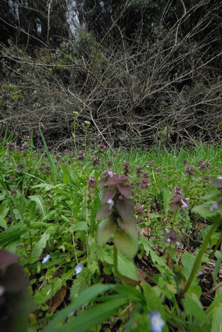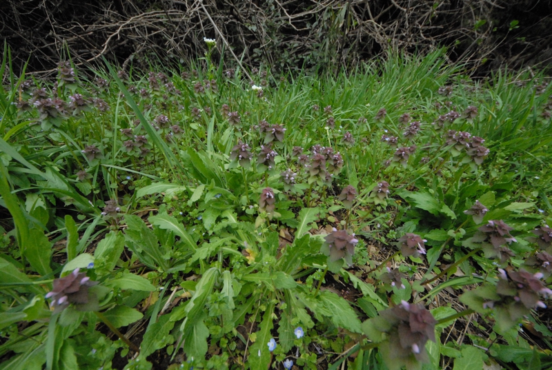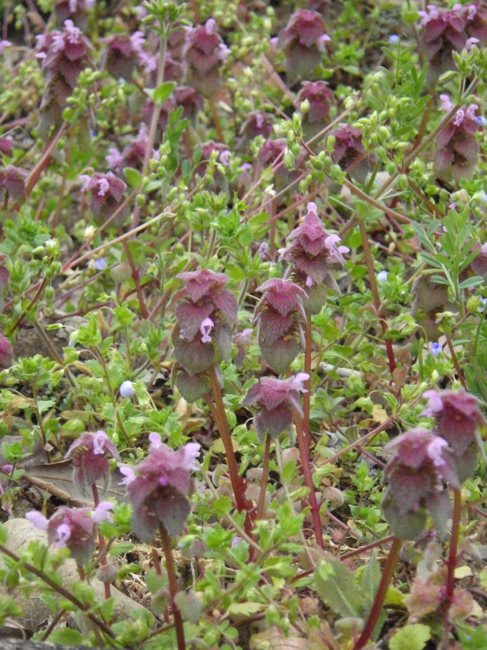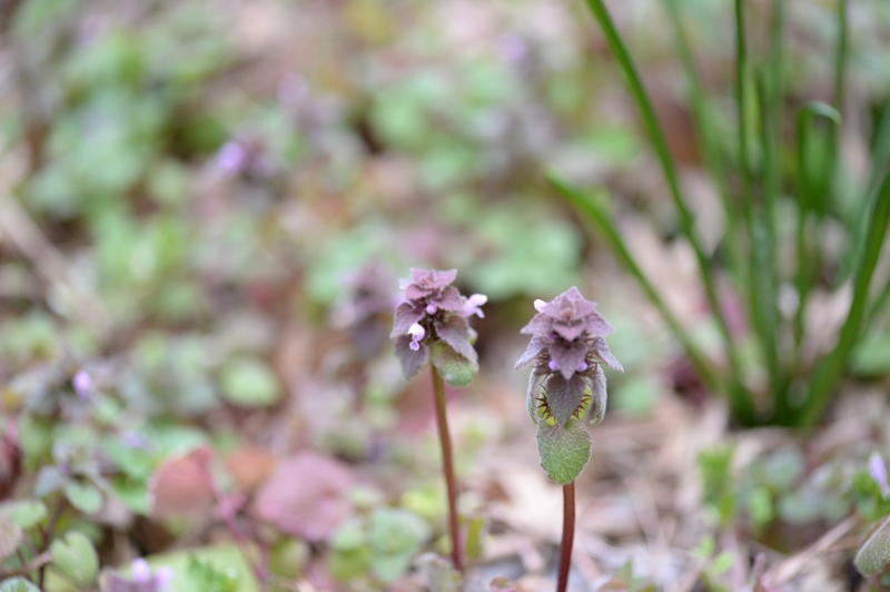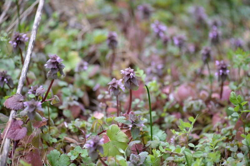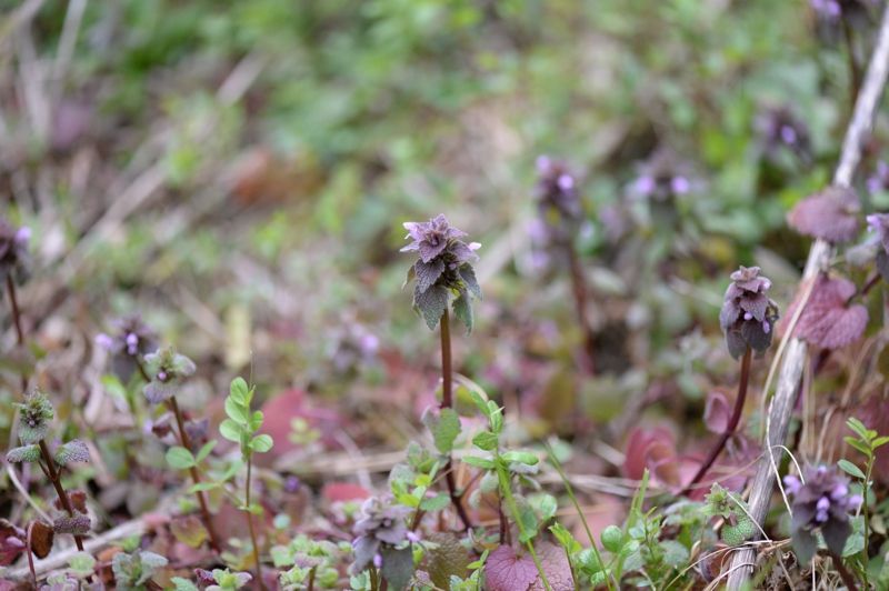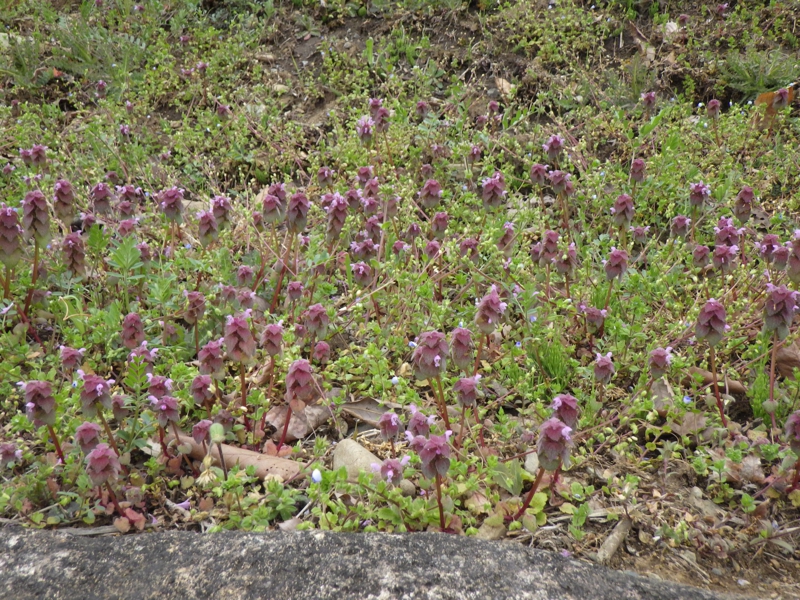 半円形の葉が向き合ってつく様子がまるで仏の座る台座のようなのが名前の由来。春の七草のホトケグサは本種ではなく、キク科のユニオタビラコの事で、本種は食用には出来ないので注意。葉が段々につくのでサンガイグサ(三階草)とも呼ばれる。長さ2cmほどの細長い紅紫色の花には、上唇と下唇があり、下唇には美しい模様が入っている。この模様がハチの蜜のありかを教える標識となり、足場にもなっている。草丈は10cm〜30cmで、道端に生える。