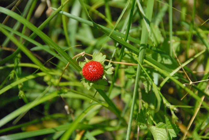 林緑や、やぶ、道端等、あまり日の当たらないところに多いつる性の多年草です。ヘビイチゴに似ていますが葉は濃い緑色でがっしりした感じがします。花は黄色い5花弁で、副萼片と呼ばれる部分がヘビイチゴよりも発達し、まるで襟巻きをしているように見えます。花後は、花庄が発達し、赤くて丸いイチゴ型になります。その周りについているツブツブが果実です。果実はシワがなく、光沢が有ります。本種の果実もヘビイチゴと同様で、読破ありませんが、まったく味がなく、美味しいものではありません。