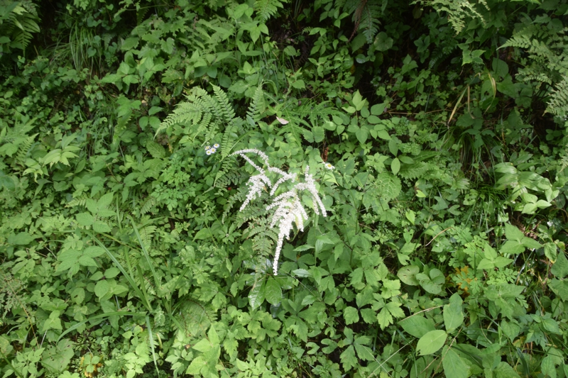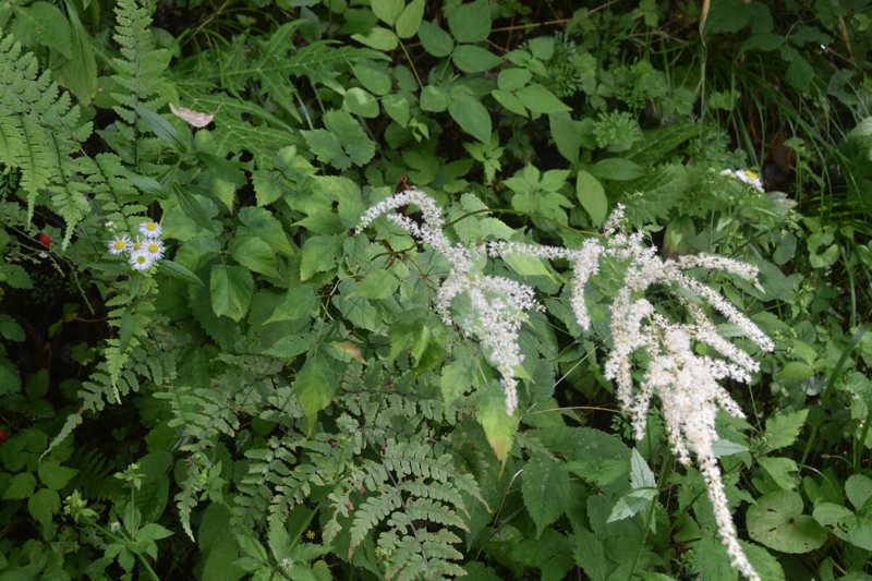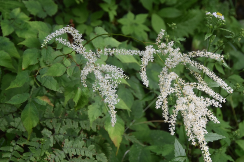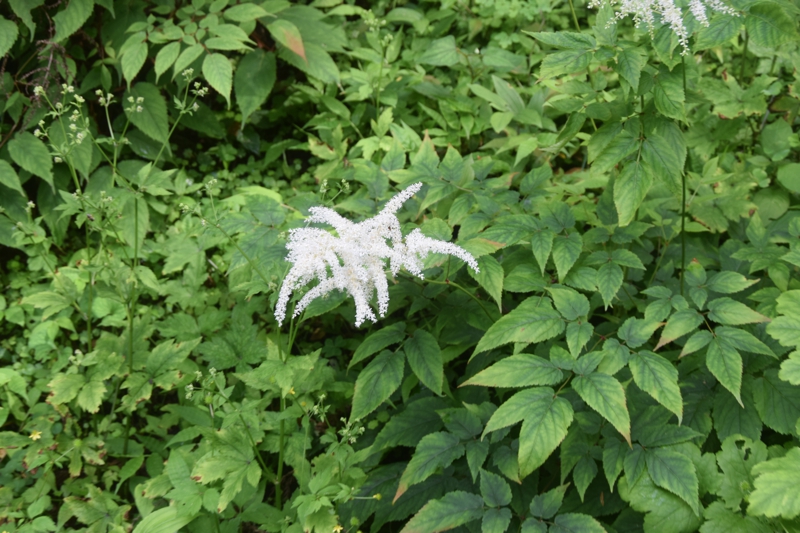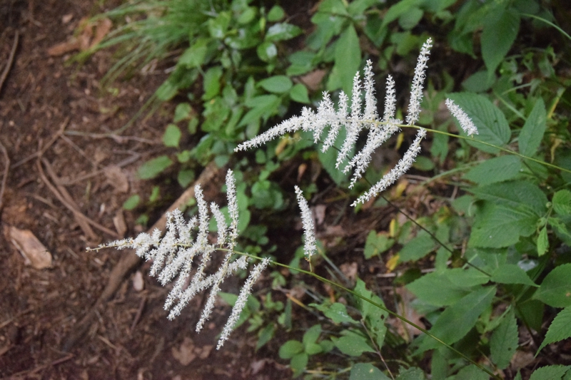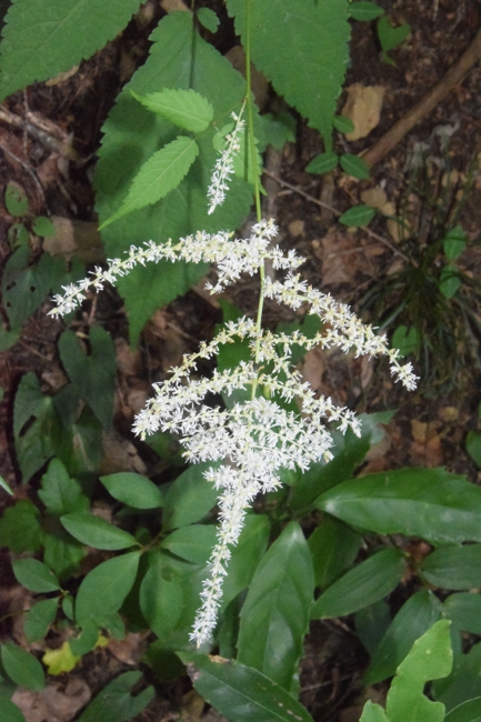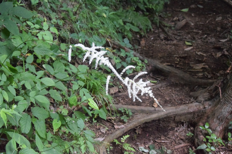 明るい林内や草地に生える草丈1m近くになる多年草。細長い花序に小さい白い花を沢山つける。葉は3回3出複葉。トリアシショウマやチダケサシに似て、区別が難しい。名は地下茎が赤く花がサラシナショウマに似るため。サラシナショウマの夏期は8月〜10月